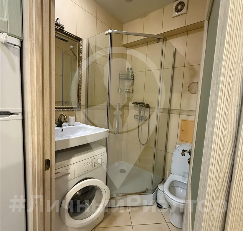 В квартире совмещенный санузел с душевой кабиной, стиральной машиной, так же установлен кондиционер. Много встроенных шкафов и мест для хранения, есть интернет и телевизор.