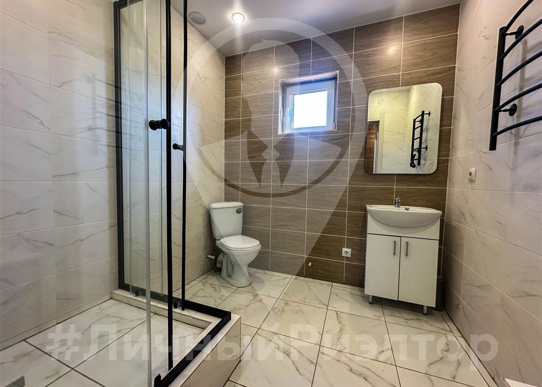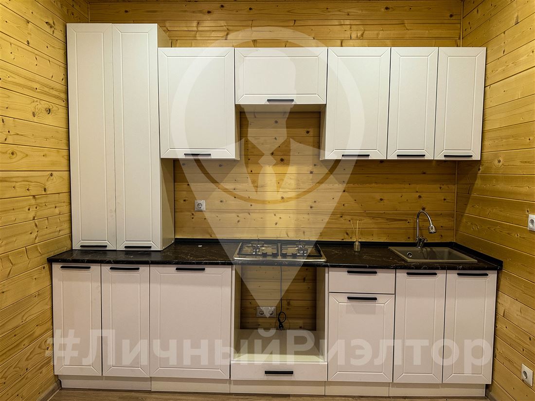В доме уже полностью оборудована ванная комната и также установлен кухонный гарнитур.