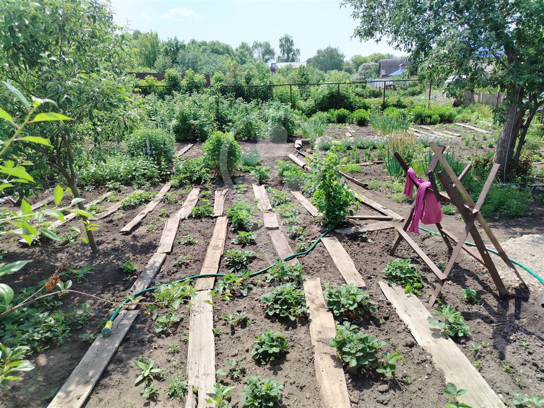 Участок ухожен, огорожен, посажены плодовые деревья и кустарники (яблоня, груша, малина, клубника). На территории имеется баня и хоз.постройки.