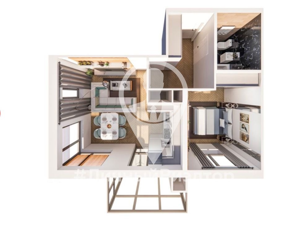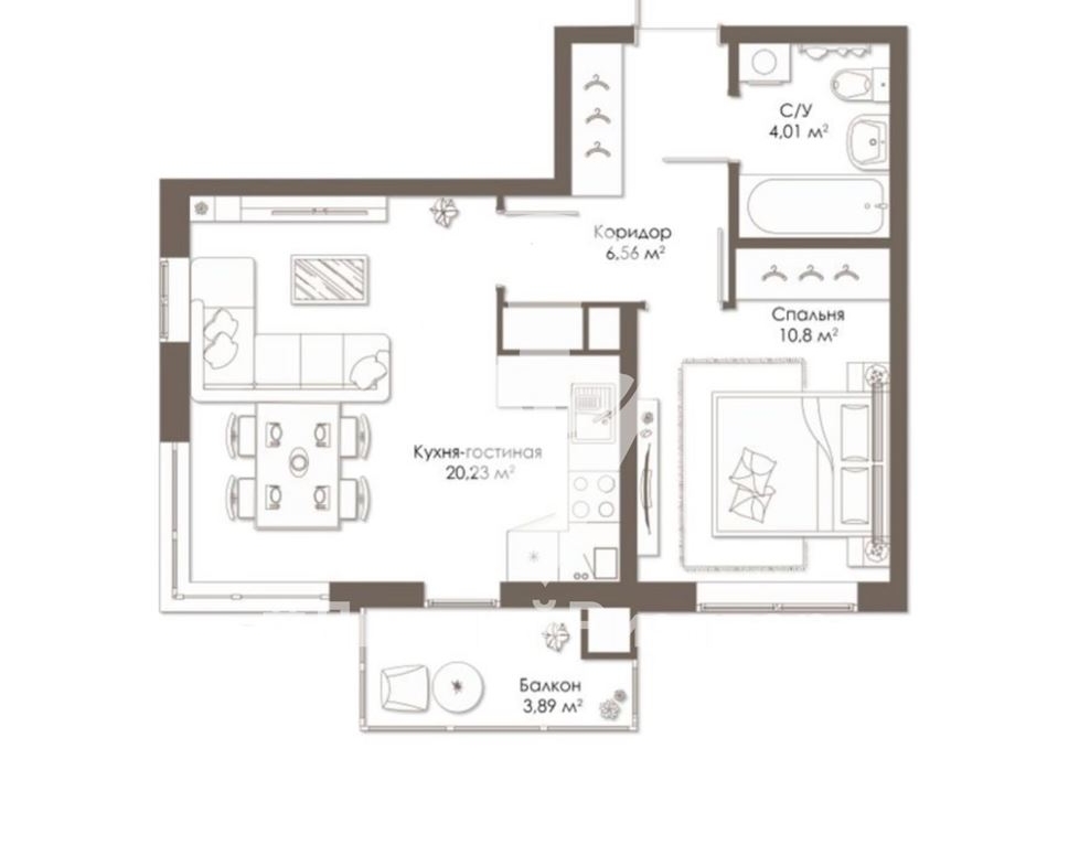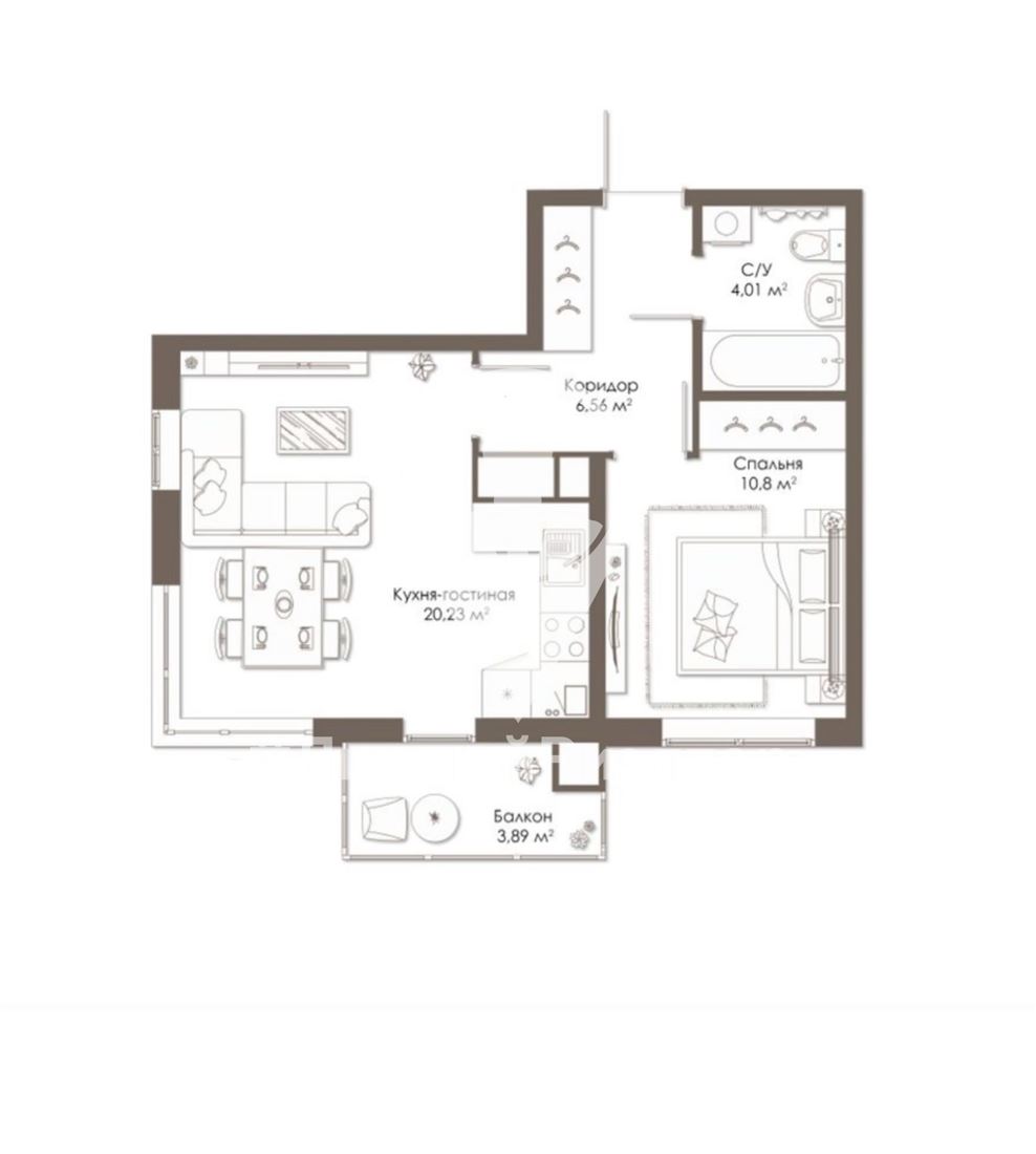 Продуманная планировка позволяет создать уют, используя каждый квадратный метр вашей квартиры. Просторная гостиная, объединенная с кухней, площадью 20 м2, позволит вам организовать комфортное пространство для отдыха и приема гостей. Из комнаты выход на балкон с панорамным остеклением. Удобная спальня с выделенной нишей для хранения вещей. Совмещенный санузел;