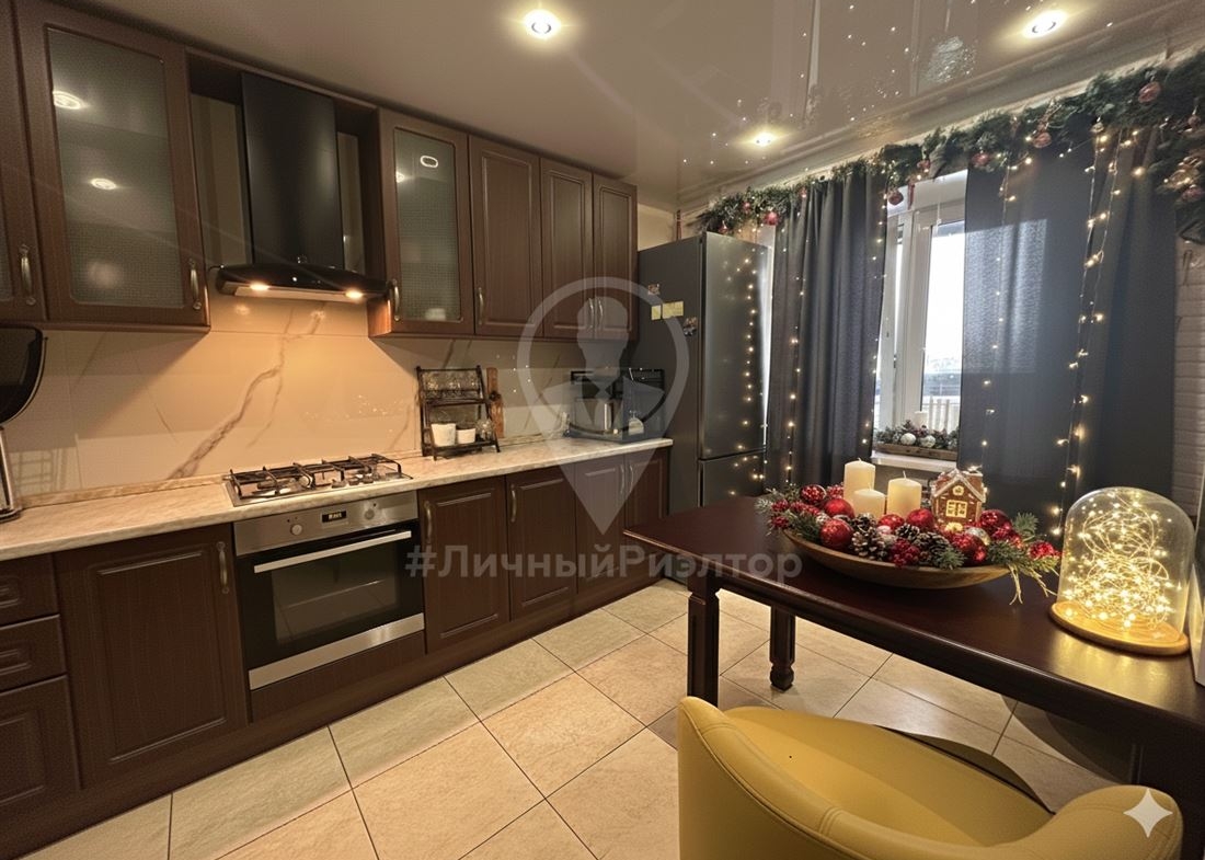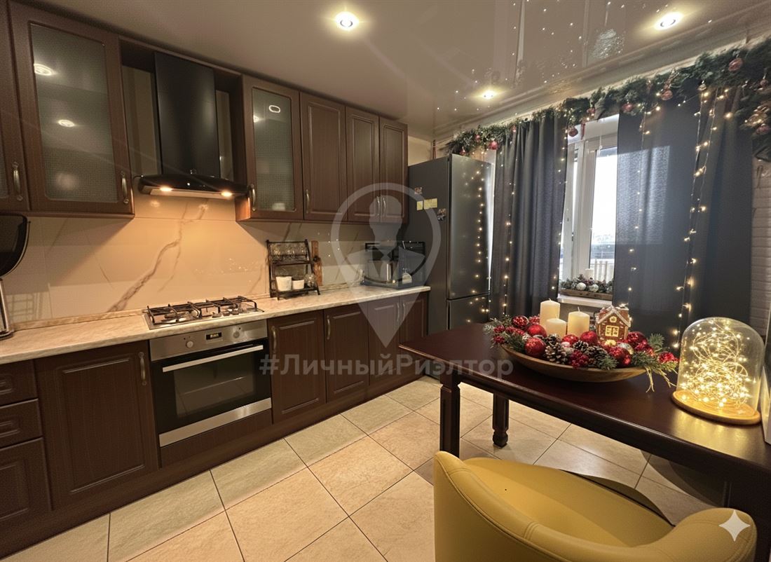 КУХНЯ-ГОСТИНАЯ: выполнена в благородном темно-коричневом цвете с классическими фасадами. Здесь предусмотрен встроенный духовой шкаф, варочная панель, современная вытяжка. Удобная рабочая зона кухни , где все под рукой.