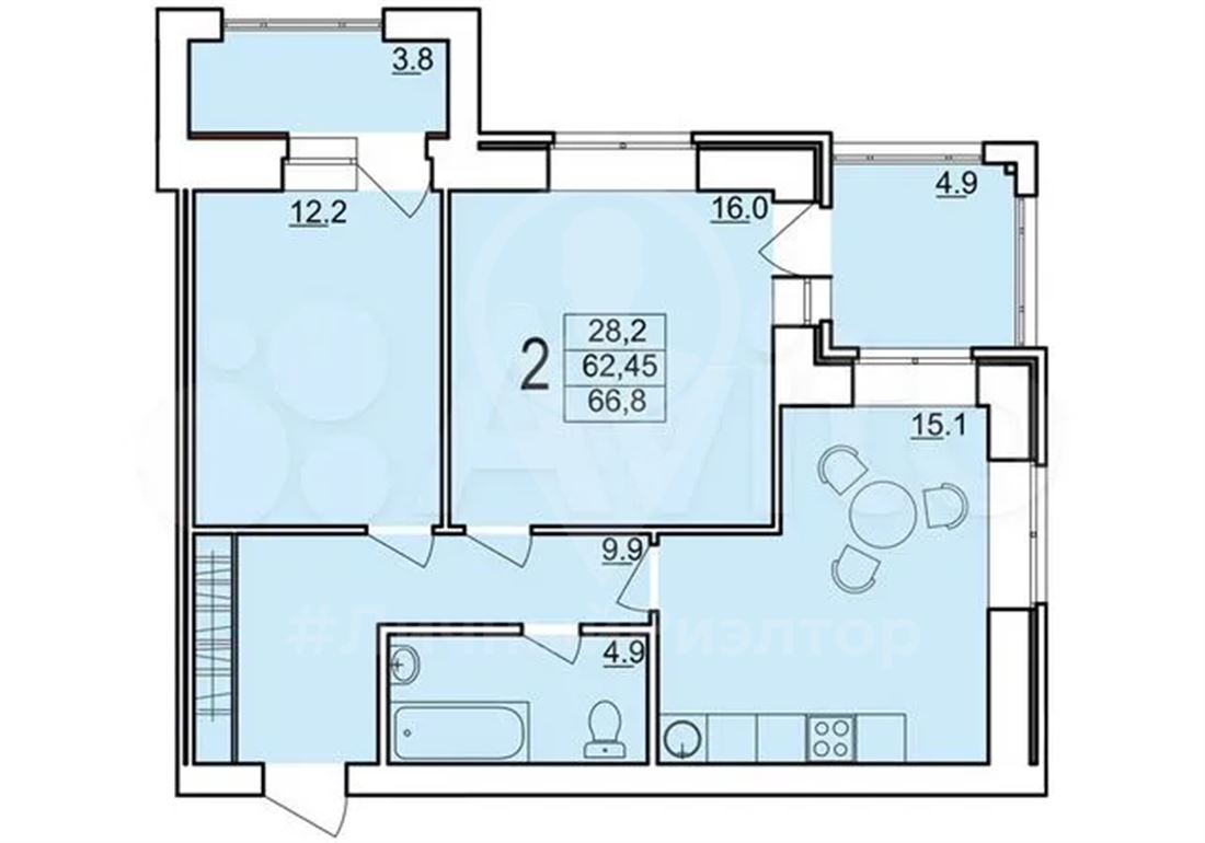 Прoдaeтcя eвpо-трешка, oбщeй плoщaдью: 66,8кв.м. из которых куxня – гocтинaя: 15,1кв.м.