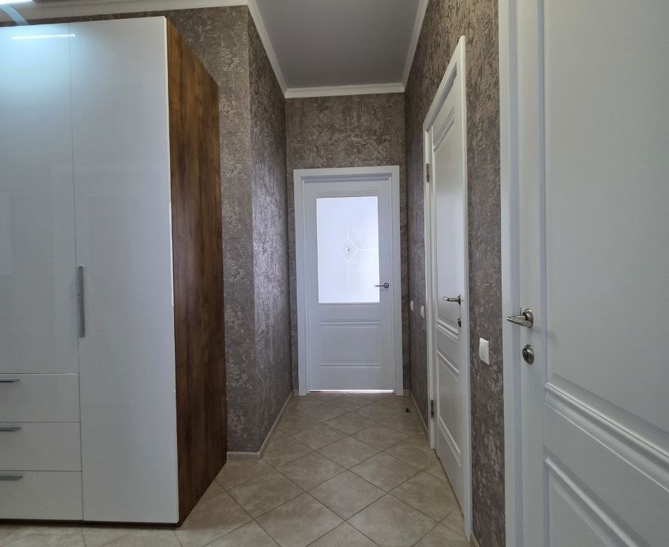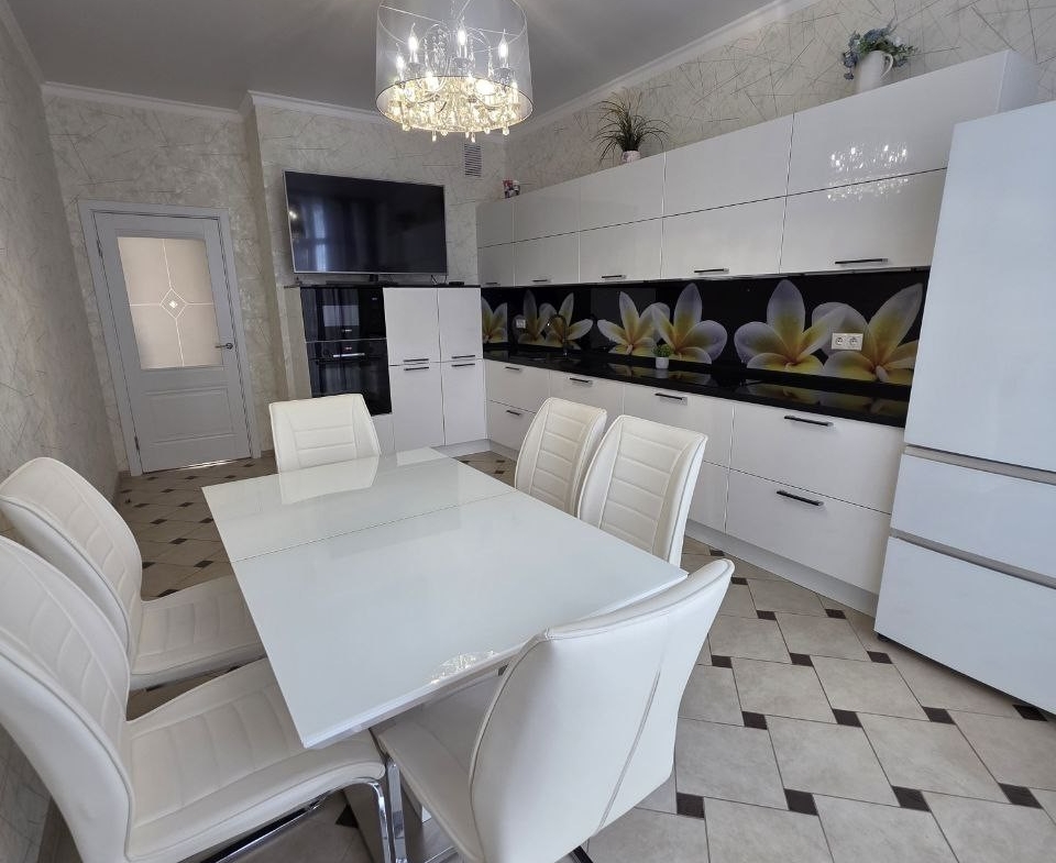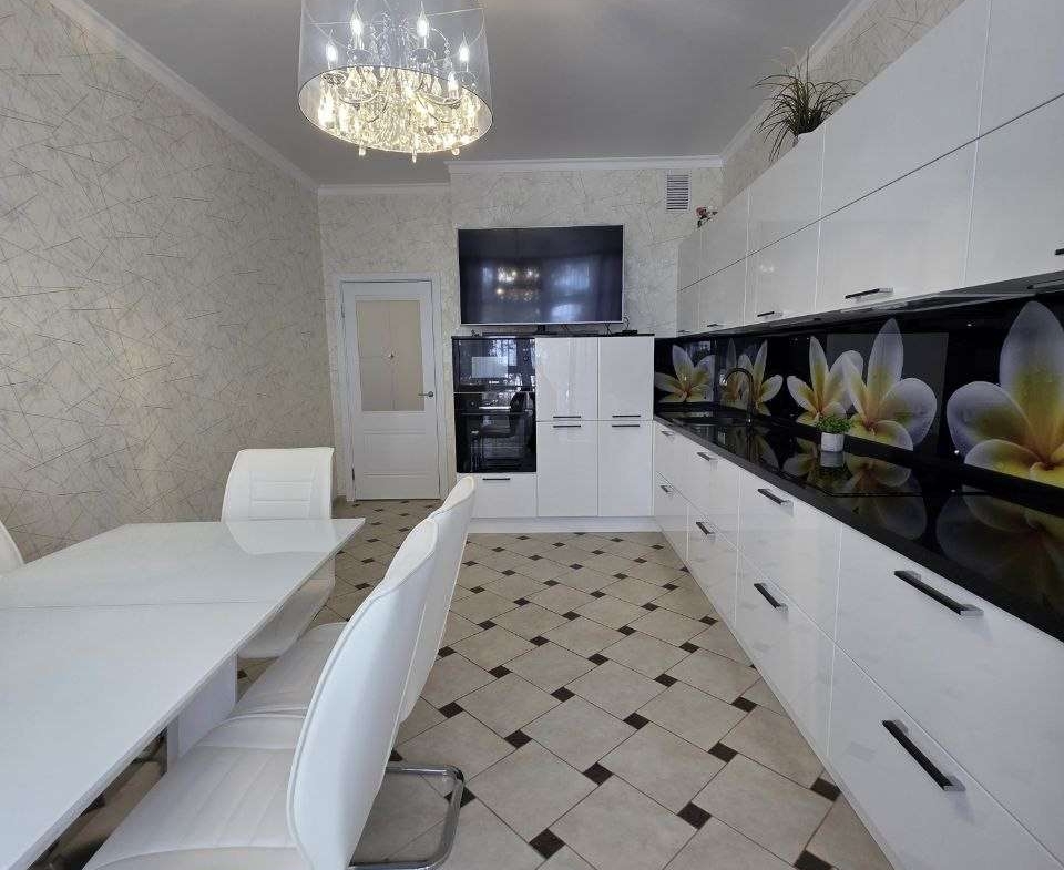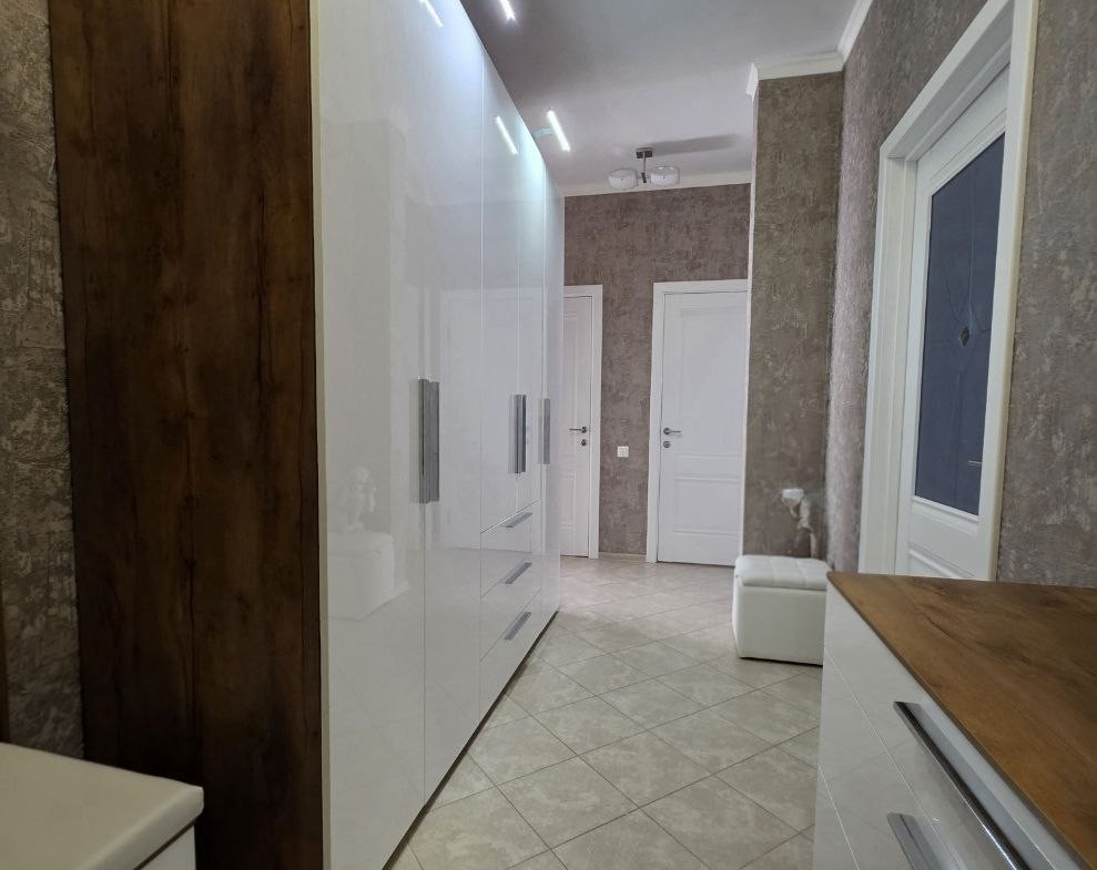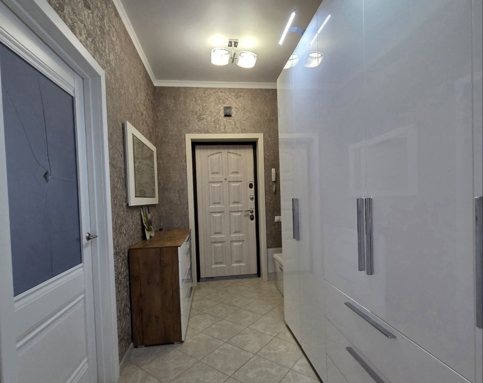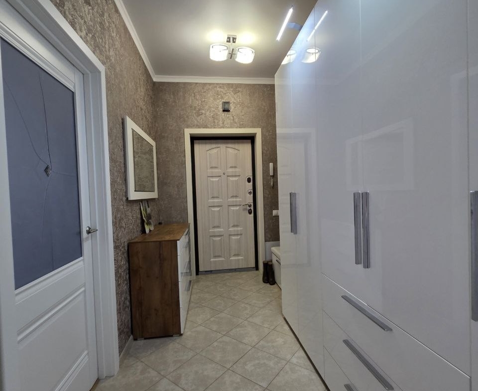 Кухонный гарнитур с глянцевыми фасадами, вместительные системы хранения в прихожей, раздельный санузел в плитке под мрамор. Состояние — «заезжай и живи».