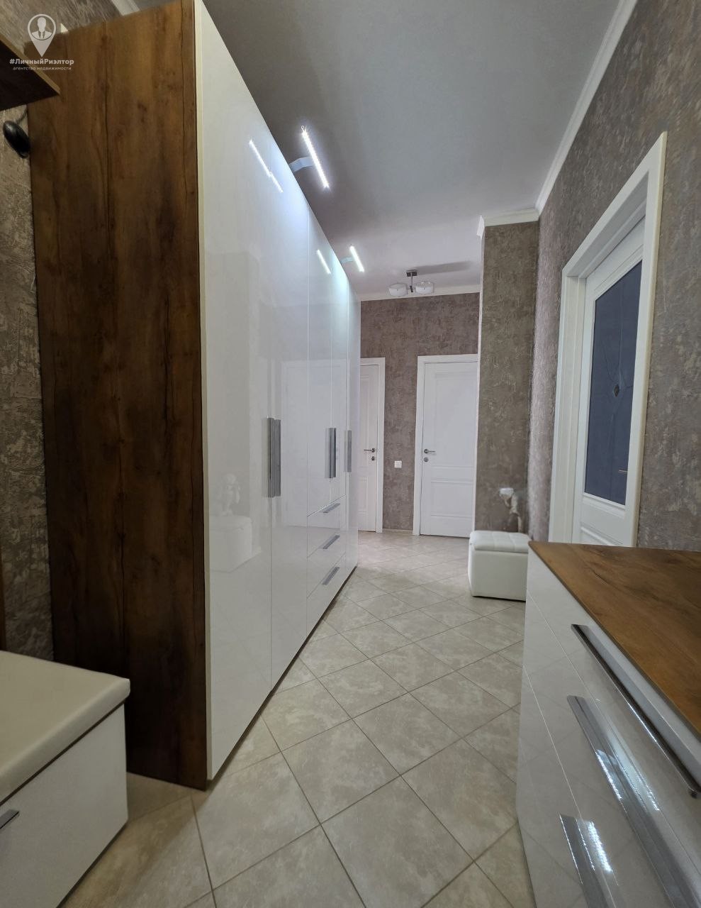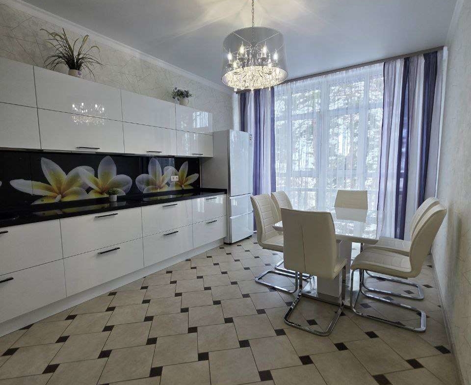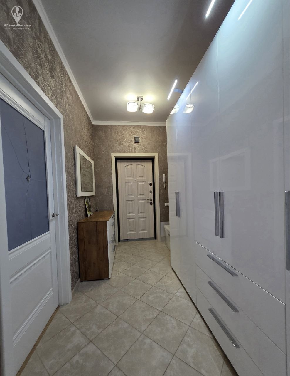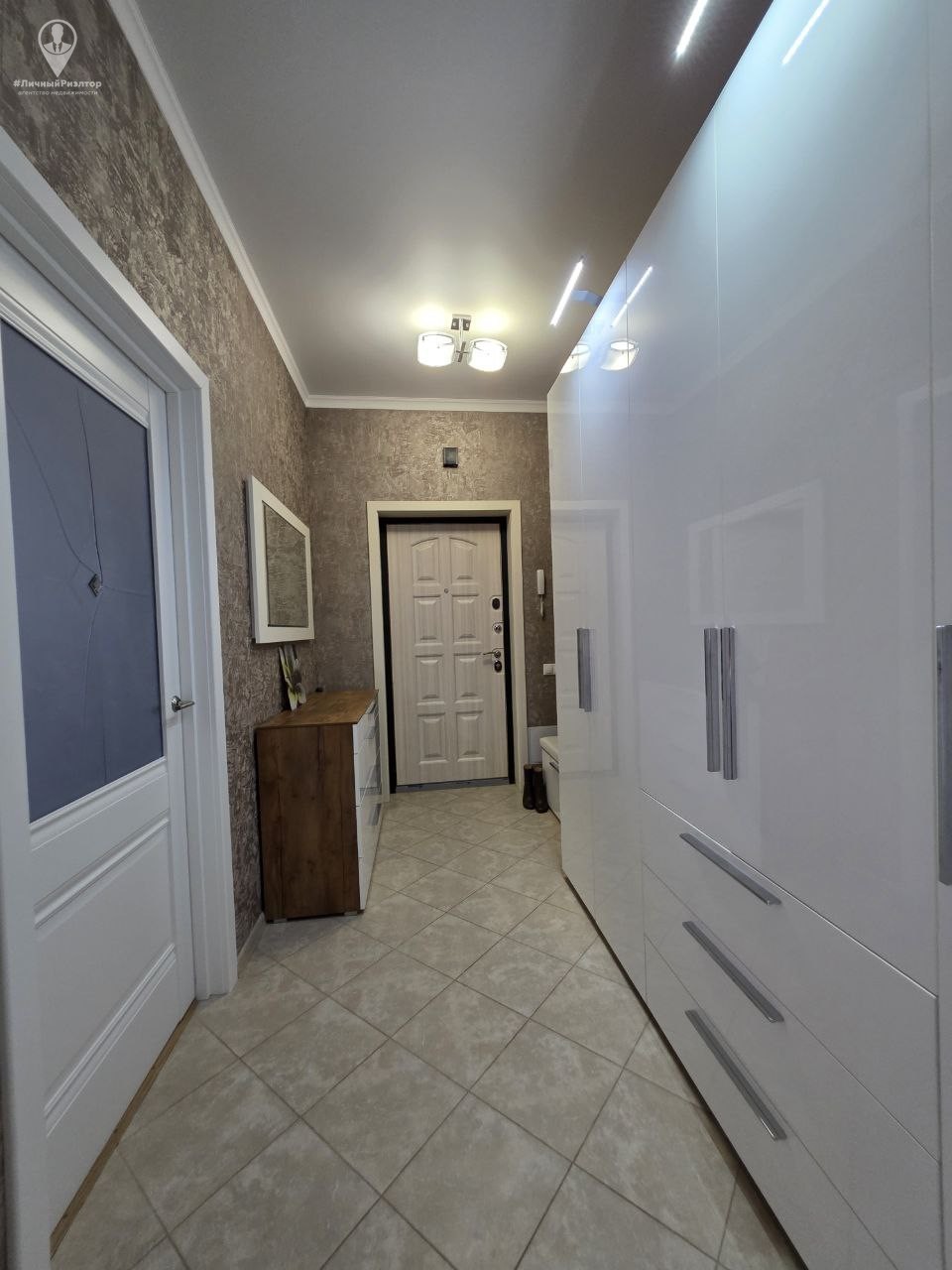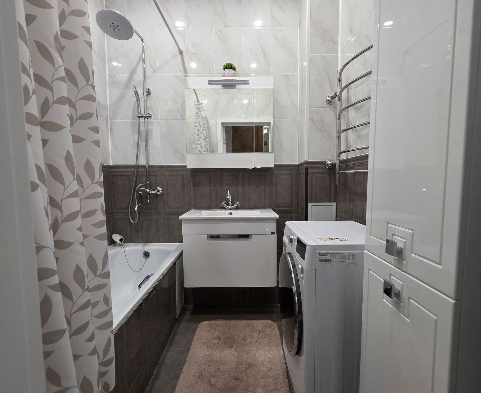 Кухонный гарнитур с глянцевыми фасадами, вместительные системы хранения в прихожей, раздельный санузел в плитке под мрамор. Состояние — «заезжай и живи».