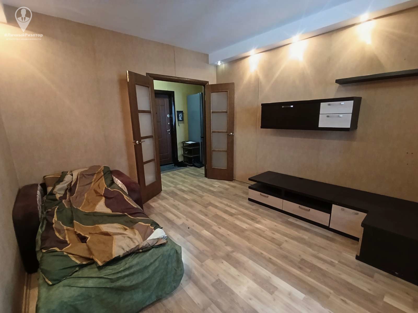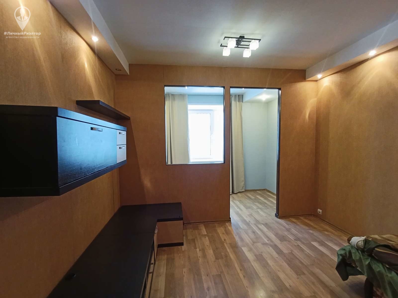 - Жилая комната отделена функциональная зона, которую можно обустроить как рабочий кабинет или уютное спальное место. Стены выполнены в теплых песочных тонах. Продуманное комбинированное освещение (центральная люстра и точечные светильники по периметру) создают яркость на любой вкус.