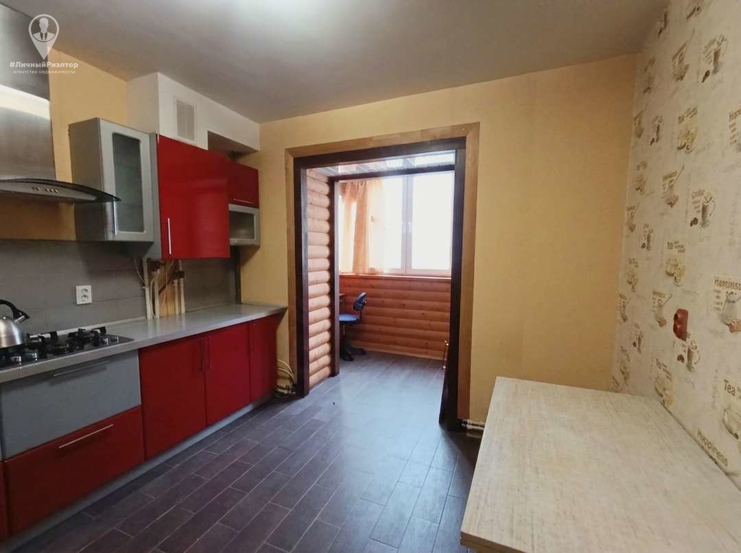 - На кухне современный гарнитур с эффектным сочетанием насыщенного красного глянца и матового серого металлика. Выход на балкон, облицованный отделочными досками.