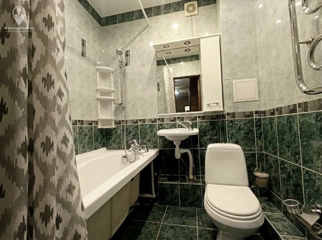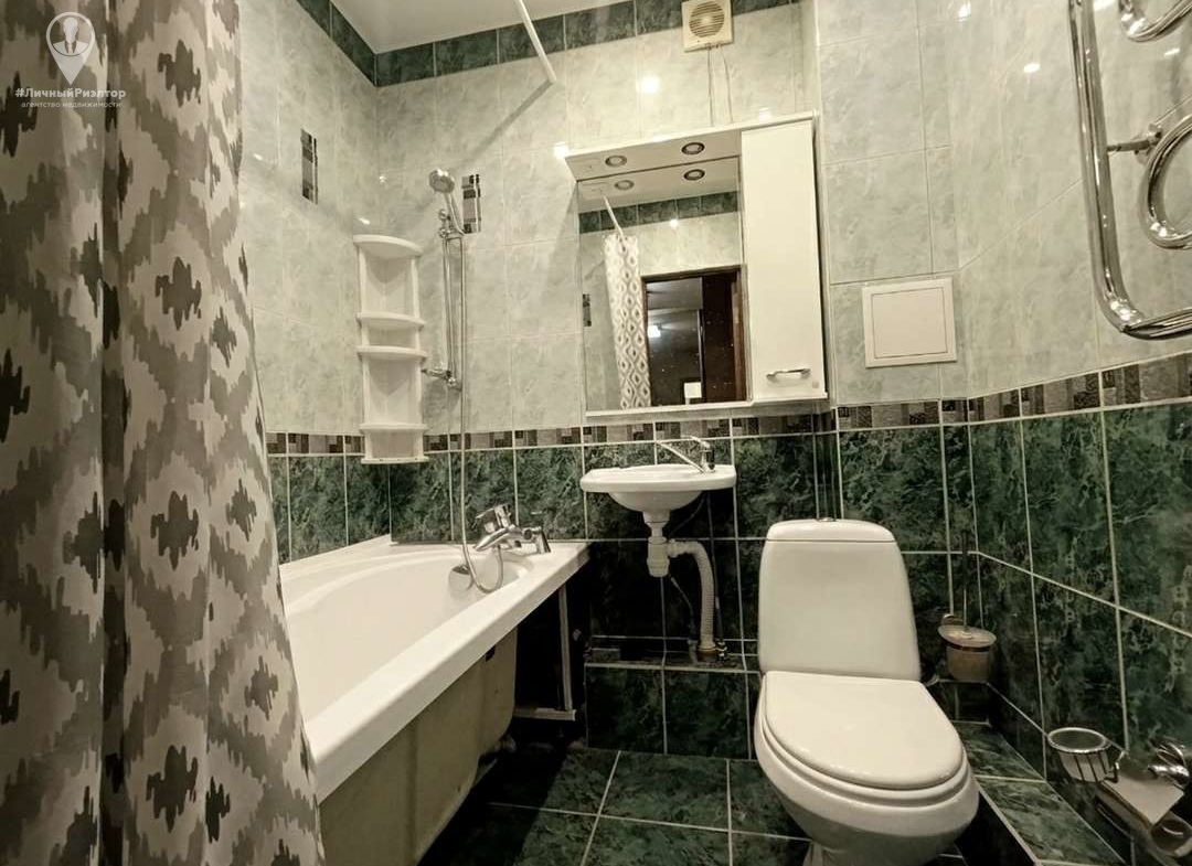 - В санузле выполнена полная отделка плиткой в освежающей изумрудно-мятной гамме. Установлена ванна, раковина и зеркальный шкаф с интегрированной подсветкой и розеткой.