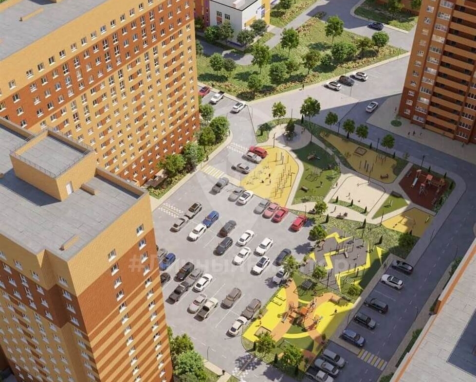 Закрытая территория двора с зелеными насаждениями, спортивными площадками, детскими игровыми комплексами, зонами с Wi-Fi. Парковка с большим количеством машиномест.