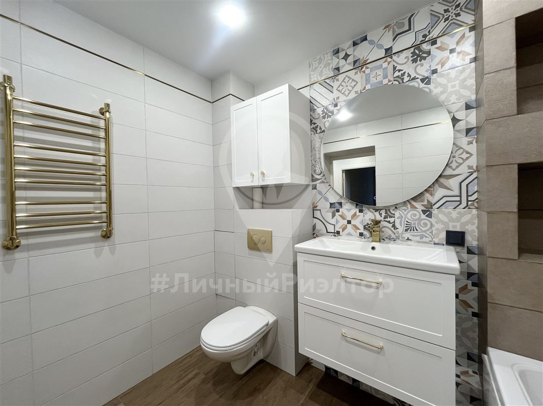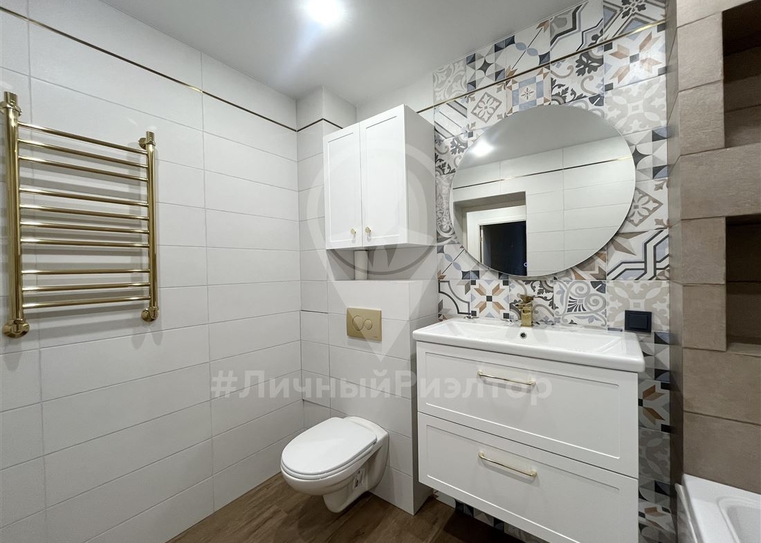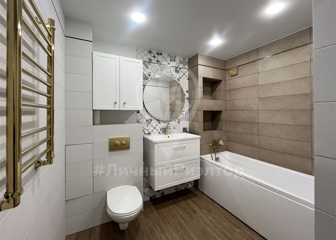 Просторный санузел (5 м²): Полностью в плитке, установлена качественная сантехника и мебель для ванной.
