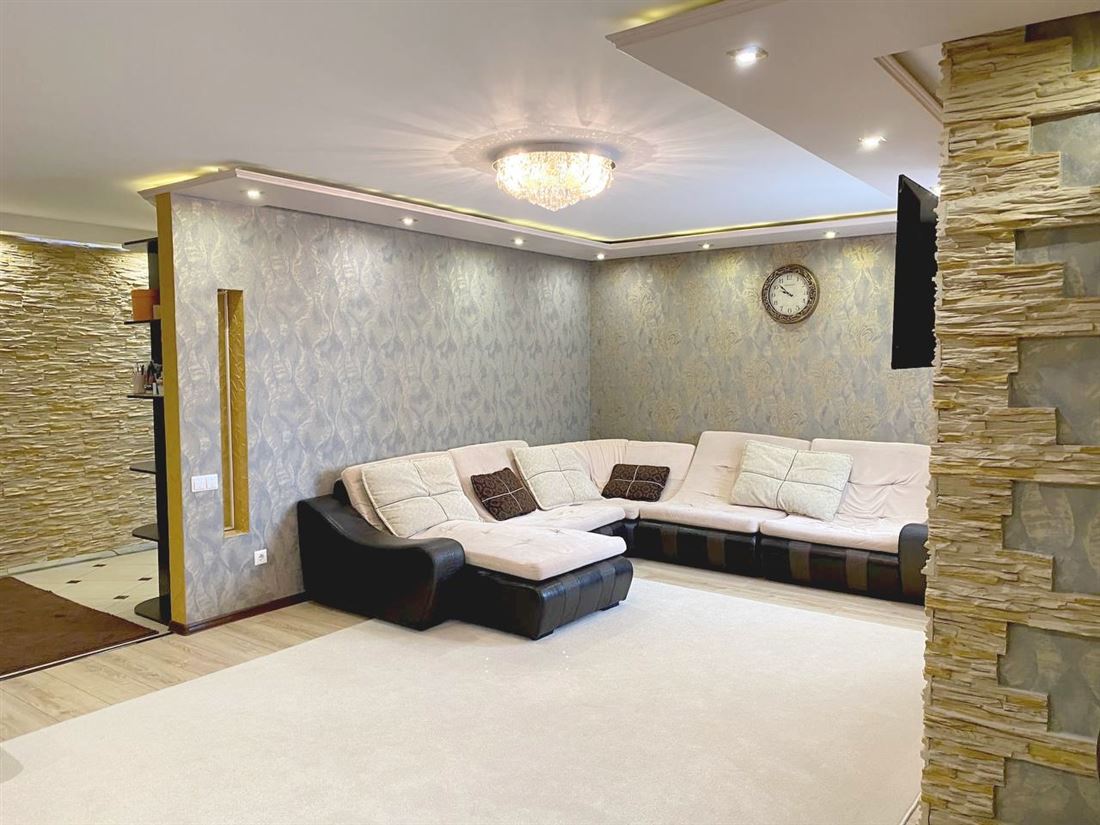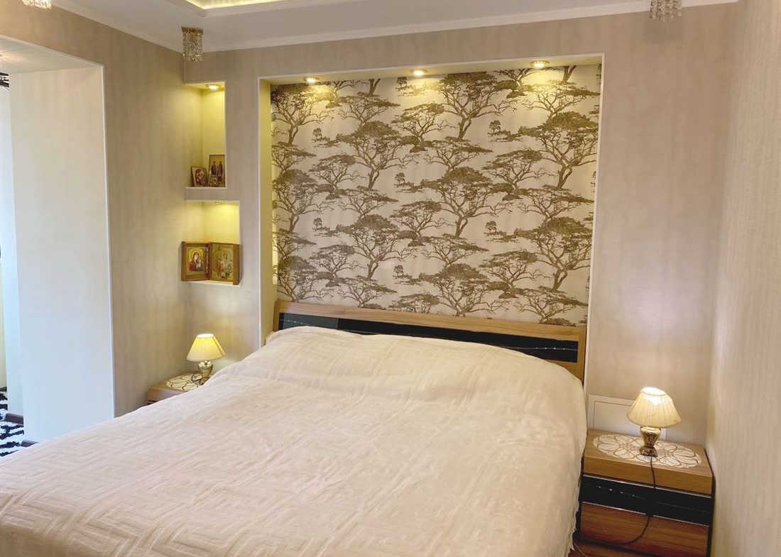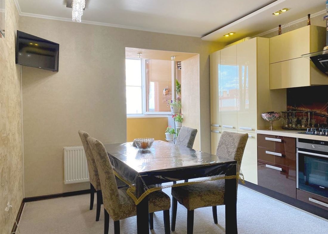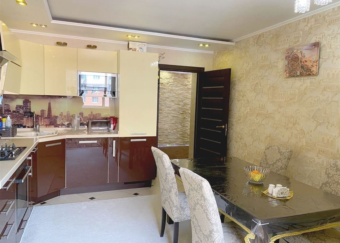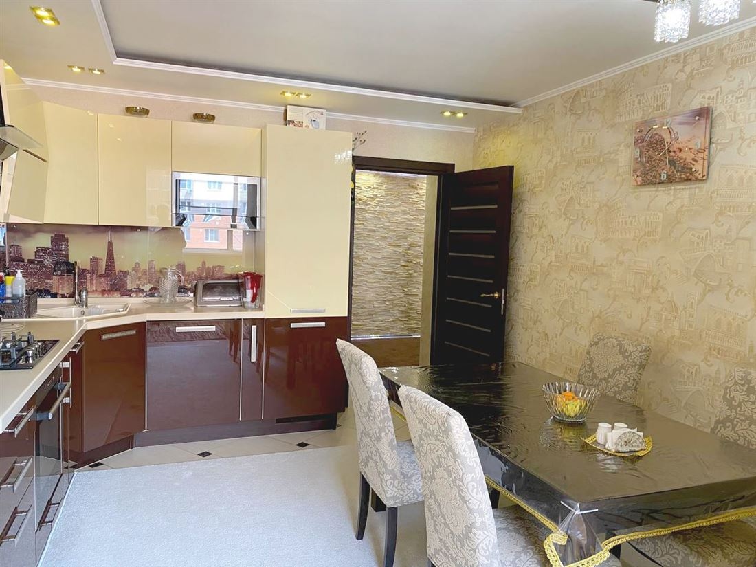 Сделан хороший, качественный ремонт из дорогих материалов, кухонный гарнитур со встроенной техникой.