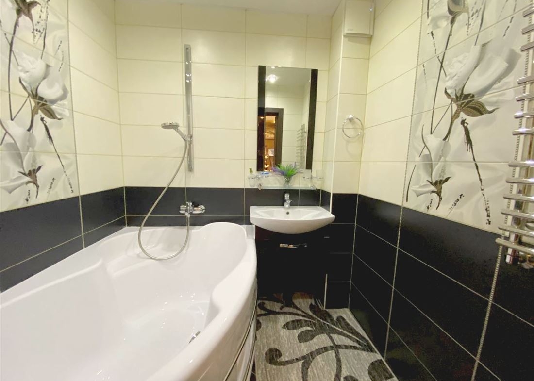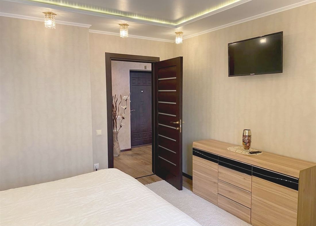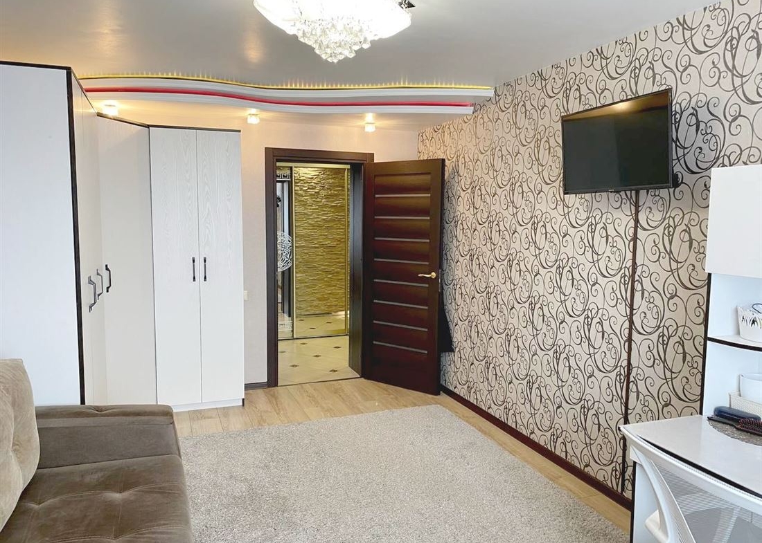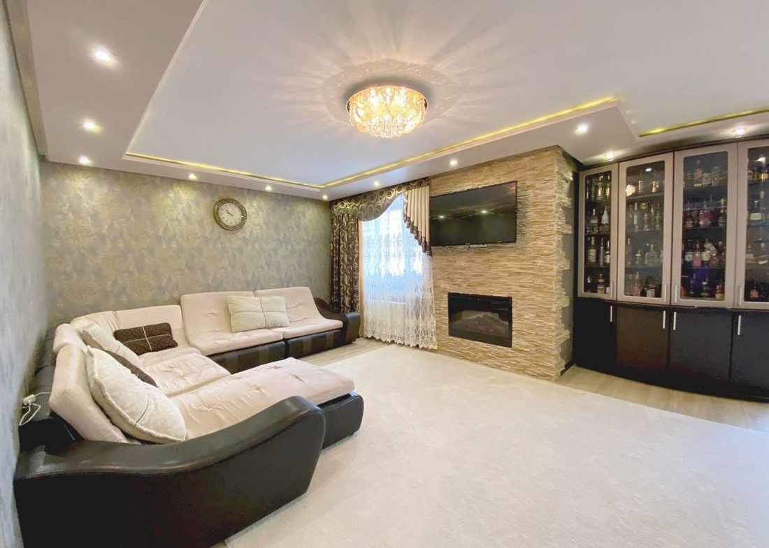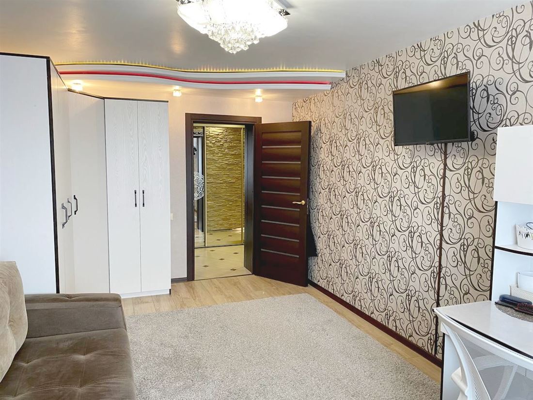 Сделан хороший, качественный ремонт из дорогих материалов, кухонный гарнитур со встроенной техникой.