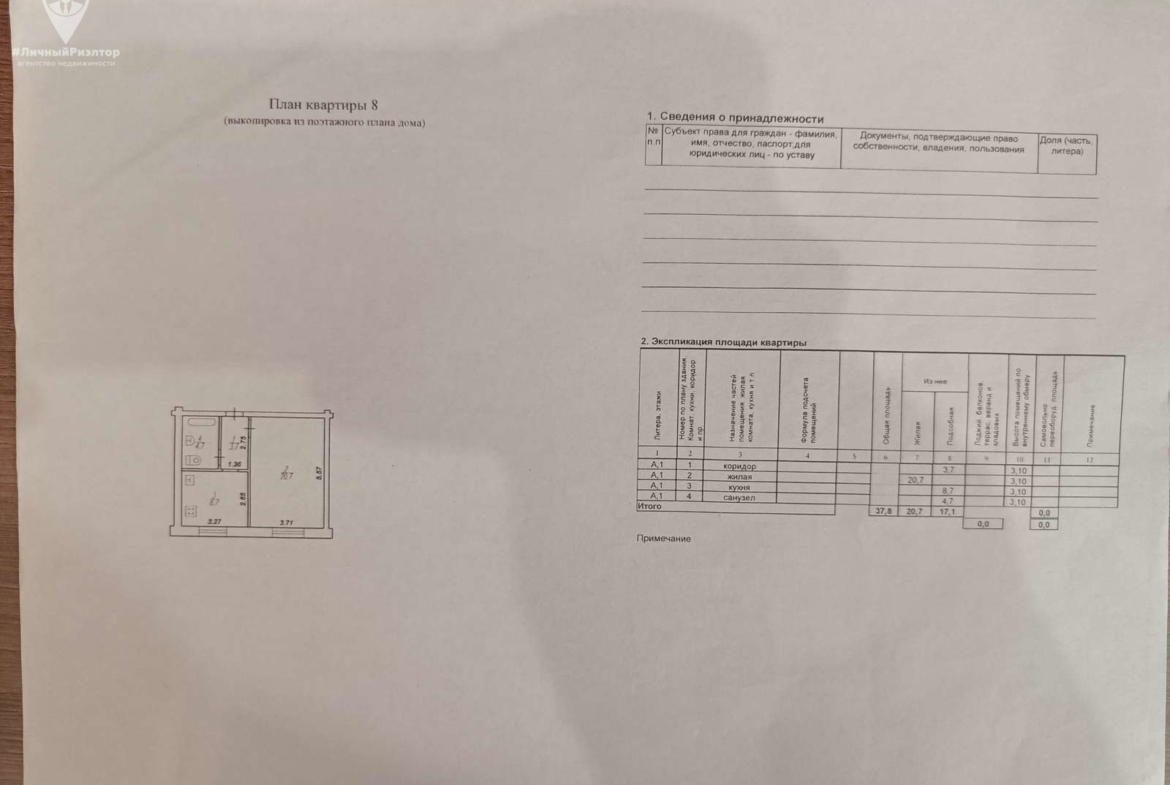 Основные характеристики: * Общая площадь квартиры — 37,8 кв. м. * Жилая площадь — 20,7 кв. м. * Площадь кухни — 8,7 кв. м.